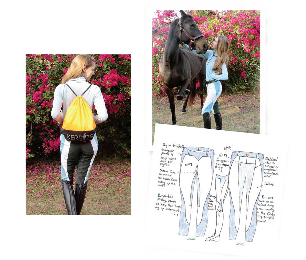 Mei also has ideas for other more basic riding tights to mix and match with colorful and decorative tops; back- packs or carriers for all of your horse gear would also be part of Mei’s future collection.
