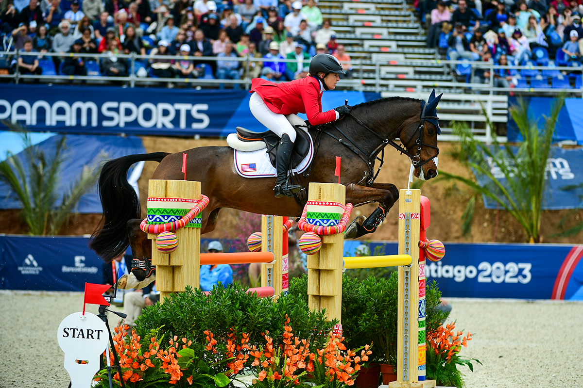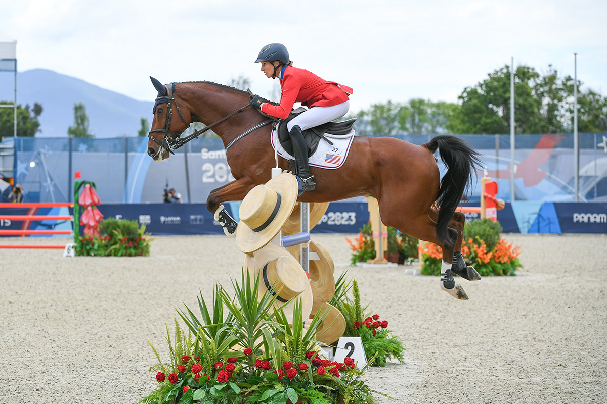 - Sharon White and Claus 63 take the first jump on course at the 2023 Pan American games. Some rails and time added 16.4 penalties and they finished in tenth place individually. Photo by Sarah E. Miller/MacMillan Photography