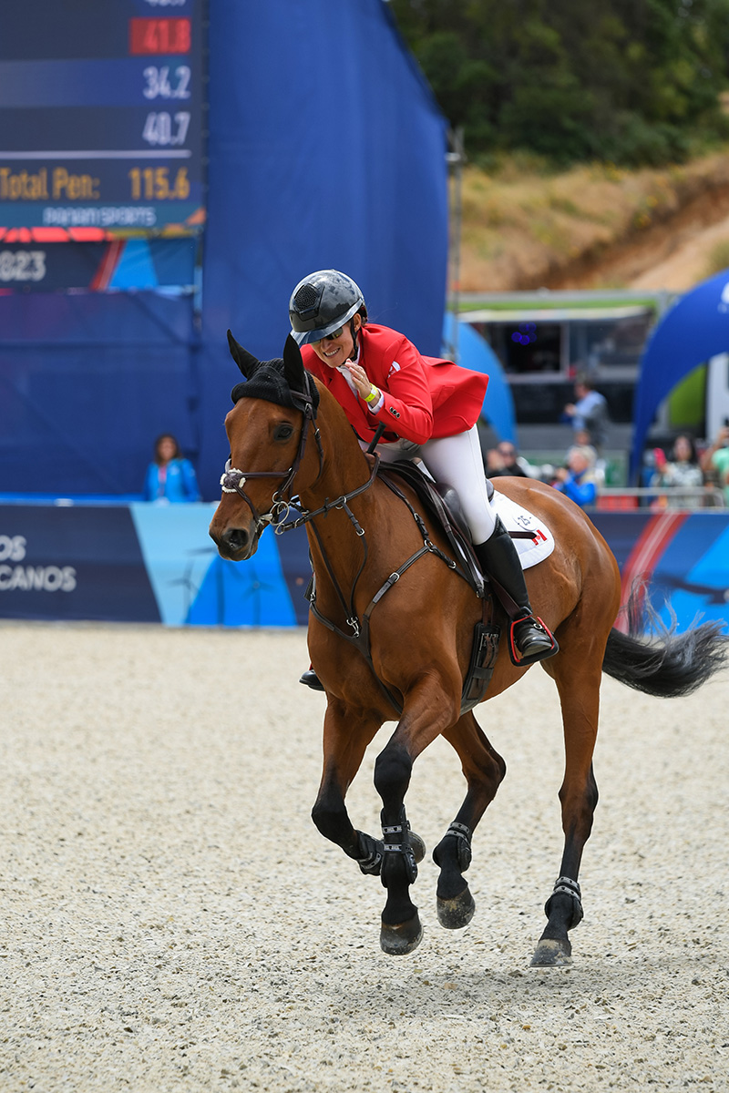 Liz Halliday, USA, and Miks Master C, a bay 11-year-old gelding owned by Ocala Horse Properties and Deborah Palmer, were next in the ring. Thus far they had had an impressive Pan American Games, being first after the dressage phase and second after cross-country. In April 2023, this pair had placed a notable third at the Land Rover Kentucky Three-Day Event CCI5*-L, but it was not to be at these Pan American Games. They dropped three rails and incurred 1.6 time faults to finish on 42.4 for seventh place.