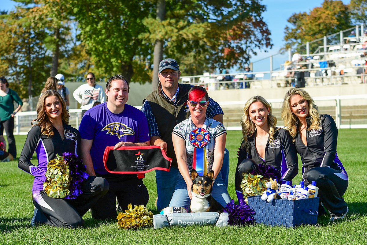- Elevation’s Zoe and her owners were presented with a plethora of prizes by Maryland Corgi Cup organizers and some of the Baltimore Raven’s Cheerleaders. Photo by Allen MacMillan/MacMillan Photography