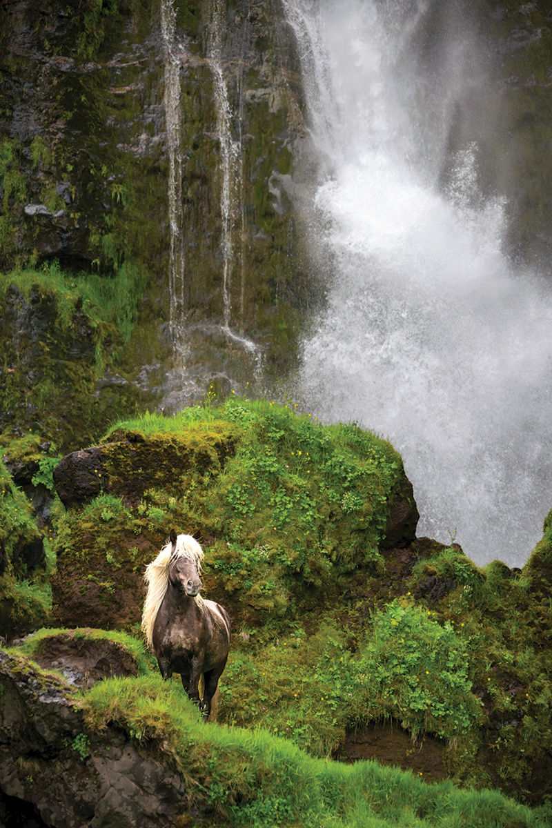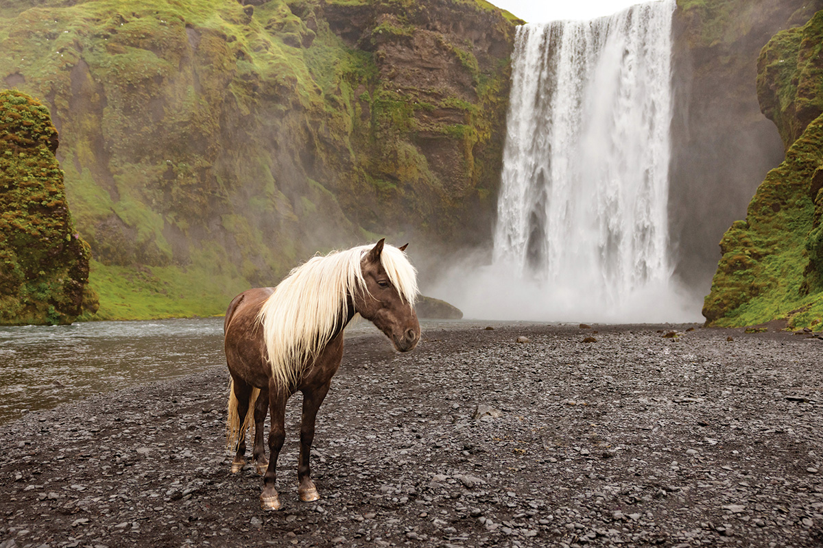 An Icelandic Horse walks past a waterfall
