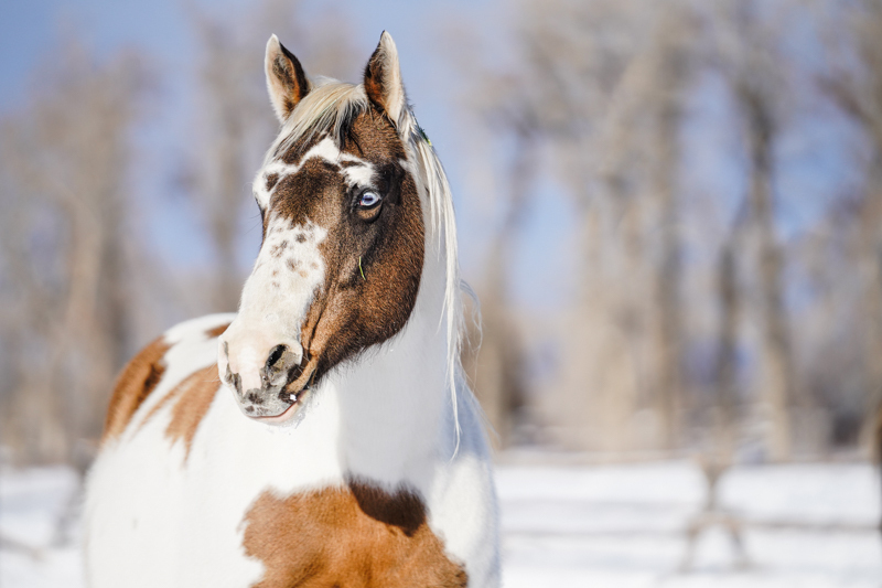 Meet this stunning Paint Horse mare (registered with the American Paint Horse Association) from HAPI Trails Horse Rescue in Driggs, Idaho. Rawhide is as unique as they come! With one striking blue eye, one brown, and a gorgeous “cat track” chestnut-and-white Paint coat, she’s nothing short of magical.