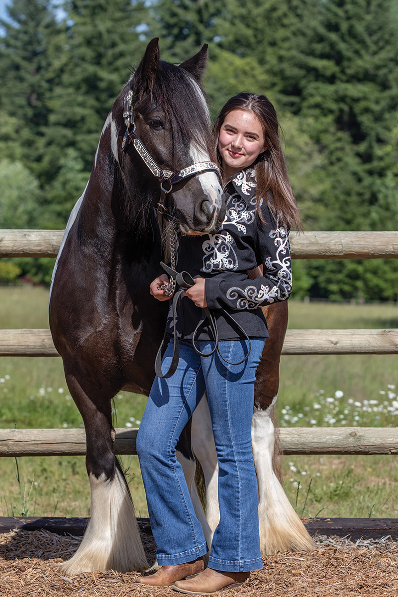Amanda Ableidinger is the 4-H leader of the Ravenna Riders in Clark County, Wash. Her unique 4-H program is made up almost entirely of Gypsies. She provides free lessons to members of her 4-H group, who show her Gypsies, including Hopkin’s Infinite Perfection (“Infinity”), a 2015 black tobiano mare. Infinity began her journey as a 4-H horse at the age of 2 with in-hand competitions.