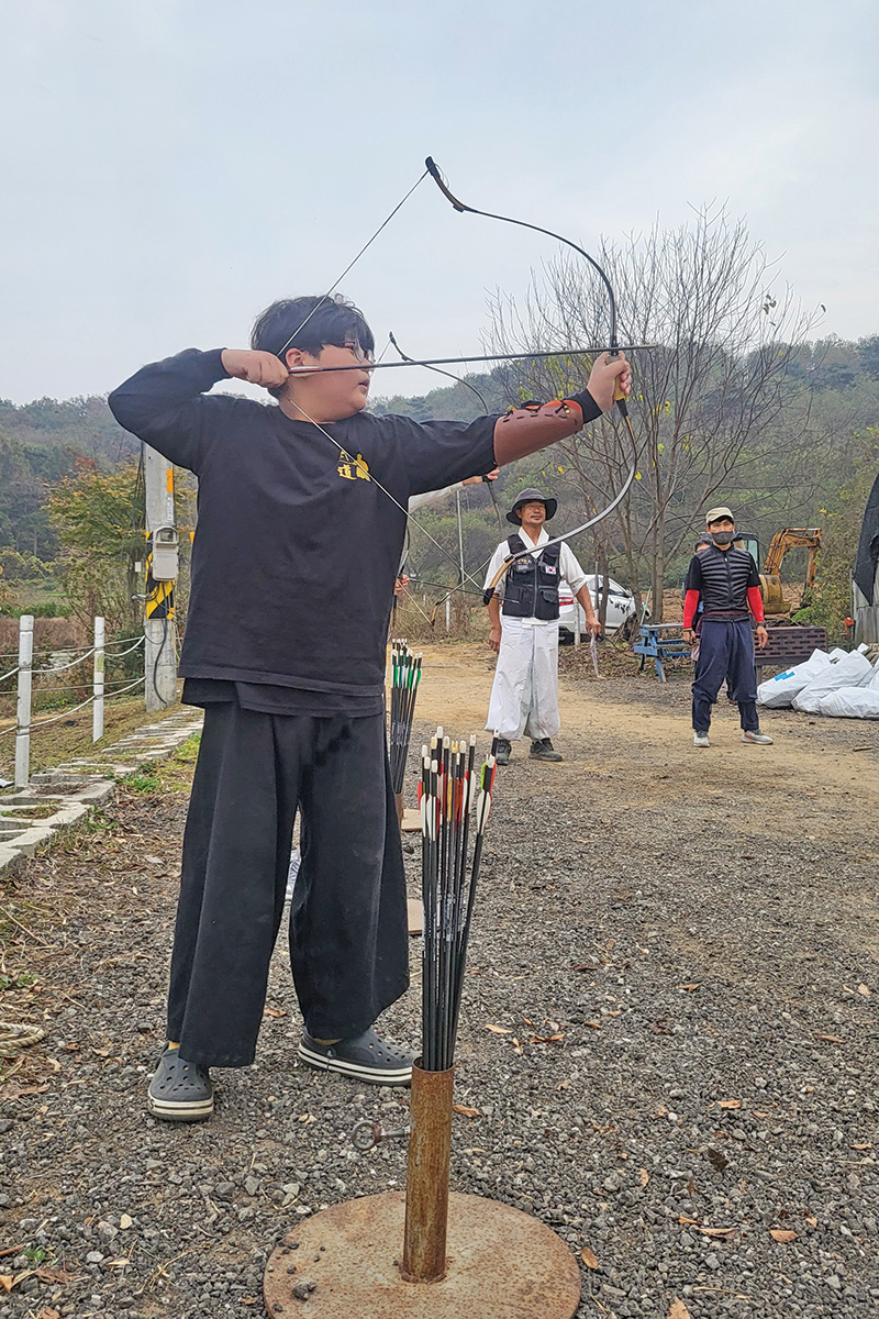 The spectators move from the riding arenas to a shooting range, where a number of children are already lined up and ready to compete in 15-meter archery. The winner is 12-year-old Han Tae Hyung, who has been practicing archery and horseback archery on the farm for two years.