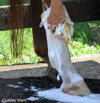 A horse with white legs stands out in a crowd. But those flashy white stockings require some regular grooming to keep them looking their eye-catching best. White stockings can look dingy, dull and yellow for two reasons: The hair...