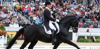 Take caution when introducing a horse to ground poles or cavalletti. If he’s only worked with ground poles, but has never trotted raised cavalletti, introduce one raised pole at a time, increasing the line as he becomes accustomed to the exercise. Have him go into the pattern straight, keep contact with his mouth light and leave him free to use his body correctly. Always urge him to go forward so that he learns to develop rhythm and tempo through the exercise.
