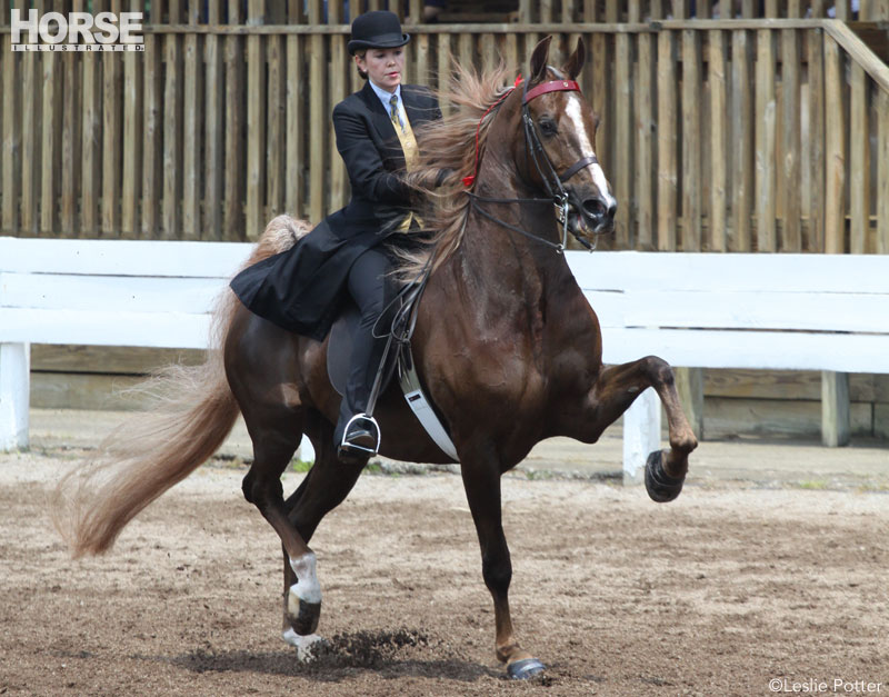 English pleasure can be a confusing title for riders coming to the breed circuits from local open shows. At riding clubs and schooling shows across the country, English pleasure classes are typically filled with hunt seat riders competing on the flat. However, for Morgan and Arabian exhibitors, English classes are strictly saddle seat. The Saddlebred equivalent is show pleasure, which is restricted to amateur riders and divided into three-gaited and five-gaited divisions. If your horse has plenty of natural action and energy, consider moving up to English or show pleasure.