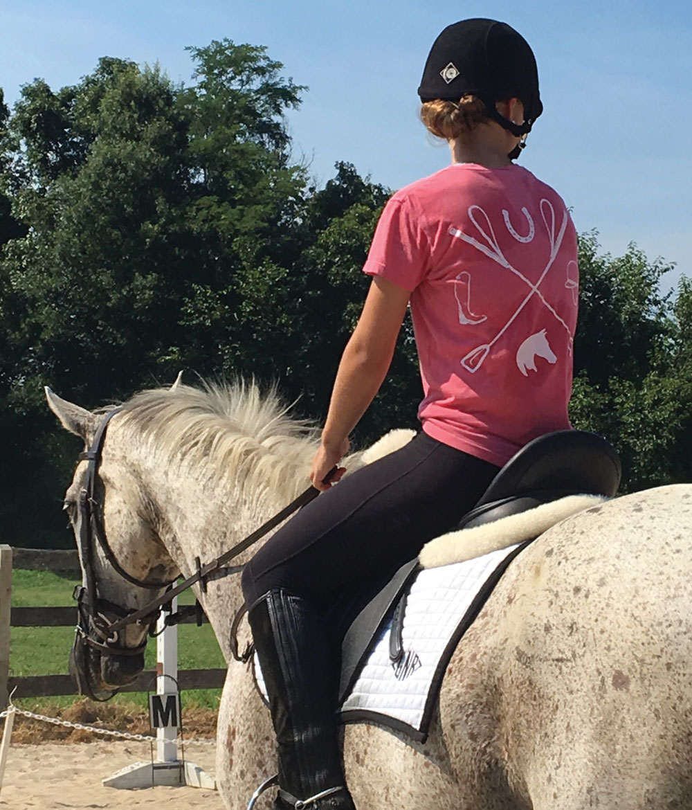 One of the company’s current best sellers is a pink T-shirt with a simple but unmistakably equestrian graphic featuring two crossed crops, a riding boot, helmet, horseshoe, and the APO logo.