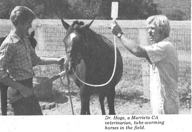 | This image from the May/June 1981 issue of Horse Illustrated shows a vet administering anthelmintic drugs via nasogastric tube. |
