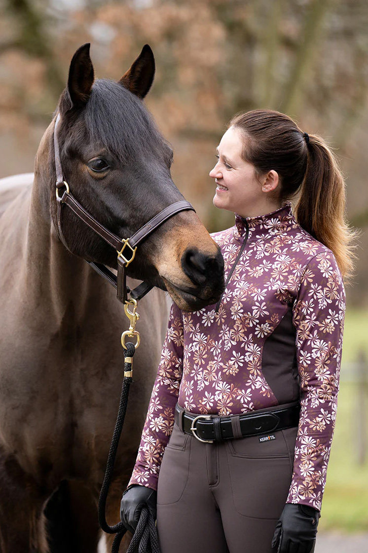 When it arrived, I was more than pleased: the fabric is buttery soft; the colors are beautiful and the pattern crisp. Reviews said that this particular shirt tended to run small, so I ordered one size up and the fit was perfect. I was so in love with the design that I went back for the matching saddle pad, too. The shirt is currently sold out, but you can ask to be notified when it’s back in stock.