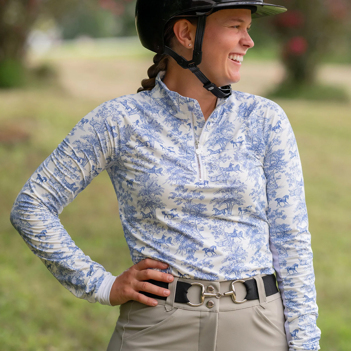 When an ad for Dapplebay’s riding top in a French toile de Jouy pattern ($58) appeared on my social media, I visited the website and contemplated the shirt. While I’d found myself on Dapplebay’s site a few times before, I’d never committed to a purchase (you know, the whole mental game of “do I need this, or do I want this?”). But something about this classic blue and white pastoral pattern made my “want” win over, and I completed my order. I am usually an end-of-season sale shopper and rarely pay full price for something that I don’t need, but I loved the look of this pattern and was curious about the quality.