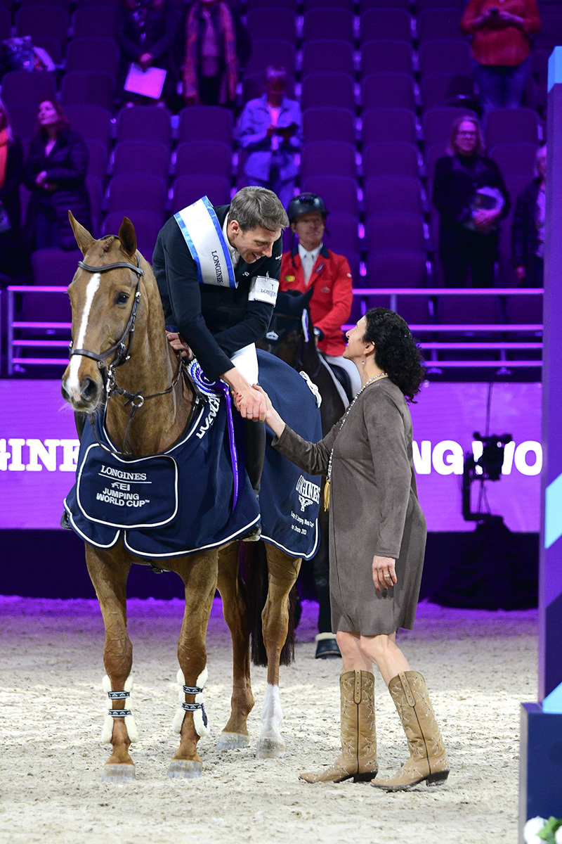- Sweden’s Henrik von Eckermann accepts congratulations from Omaha World Cup Finals Honorary Chairwoman Lisa Roskens on his win in the Jumper Speed Class on Wednesday, April 5. Photo by Sarah Miller/MacMillan Photography