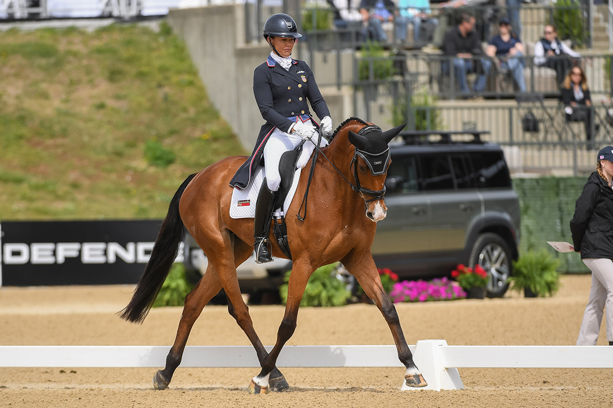 At the end of the first day of dressage at the Land Rover Kentucky Three-Day Event CCI5*-L, the leaderboard is competitively stacked, with only 12 points between first place and tenth.