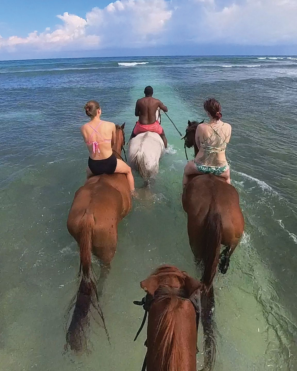 My friend Beth and I looked at one another and grinned before returning our full attention to our guide, who explained how we would ride our horses into the water and get ourselves into position for an “only in Jamaica” experience: floating behind our mounts’ powerful hind ends while they swam, towing us with their tails.