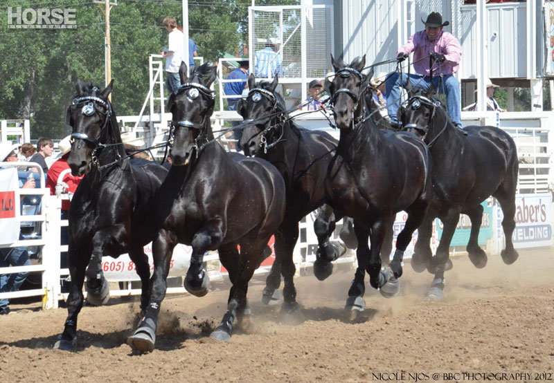 One popular draft hitch is Percheron Thunder, representing Priefert Ranch Equipment. Six black Percherons and driver Jason Goodman travel to equestrian events around the country to demonstrate exciting acts in and out of the harness, including Roman riding (above). PercheronThunder.com