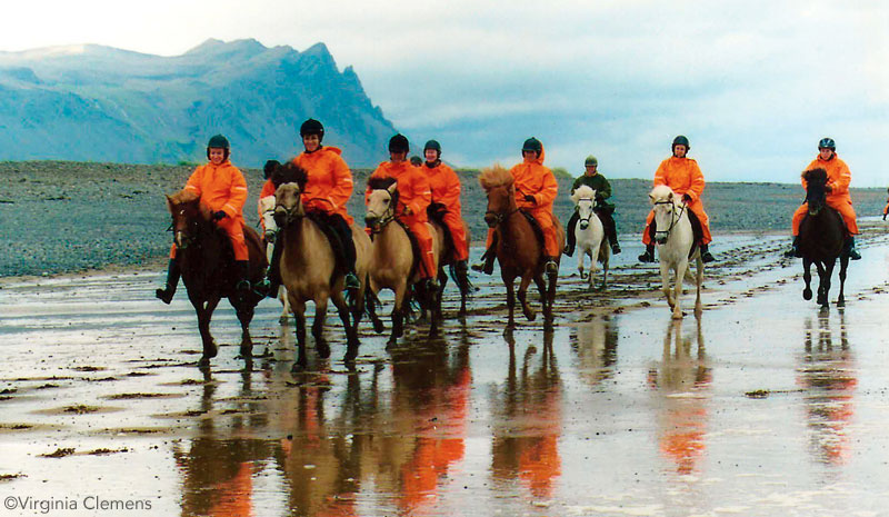 Suddenly, the horses in front of me dropped down and, except for their heads, disappeared. Before I could hesitate, my horse and the other riders’ horses alongside me plunged into a wide, water-filled channel that the incoming tide had filled. Immediately the horses began swimming as the cold water went down into our boots. The light rain and splashing sea sprayed our faces, but everyone was laughing and joking as the horses leaped onto the far bank and tölted or cantered on.