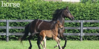 Mare and foalThe first months of spring mark the beginning of an important time in your horse’s life—the start of the breeding season. This is the time of year when pheromones fly and everyone’s in the mood for love. Horses are seasonal breeders, and engage in their mating activities during the longer days of the year so that their foals born 340 days later can take advantage of the season’s milder temperatures and lush forages. Horses of both sexes are affected by changes on their hormone levels, which tell them it is time to mate. Longer days stimulate the development of ovarian follicles (cells and fluid surrounding an ovum, or egg) in the mare that secrete estrogen as they grow, bringing the mare into periods of “heat” behavior known as estrus. In the stallion, increasing day length brings about higher blood levels of testosterone, the primary sex hormone responsible for initiating sperm production and stimulating the increase in sexually driven behavior known as libido.