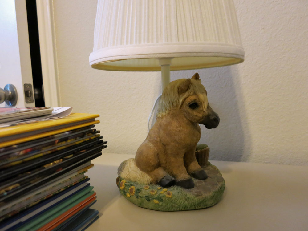 My recent rediscovery of this lamp led to me crying in laughter on my bedroom floor. (To my non-horsey friends: no, horses don’t usually ‘sit’ like this.)