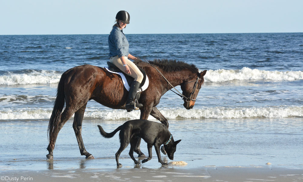Once you have perfected your ground skills, mount up and perfect them once again in the ring from the back of your horse. You should also practice mounted with your dog on a leash. This might sound ridiculous, but a well-trained dog works on a leash and a well trained horse can pony another animal. The fact that it is a dog on the end of the lead and not a horse shouldn’t matter. Being able to “pony your dog” gives you more riding options. Some trails and beaches require dogs to be leashed, I’d rather pony my dog than have to leave him at home.