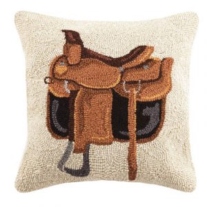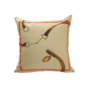 The pillow features a snaffle bit, metal hardware and leather representing a bridle. John Morris of Lexington, Ky., paints each pillow to order, ensuring no two are exactly alike. $175.00; rebeccaraydesign.com