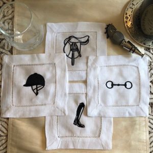 Embroidered tack room cocktail napkins for horse style entertaining. Embroidered Cocktail Napkins
