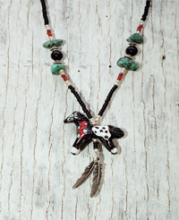 | The pony necklaces from Eccentric but Harmless feature a hand-sculpted pony fetish bead that is fired and hand-painted. They also include vintage glass seed beads and natural stones such as japser, agate, onyx, turquoise and amber. $185 |