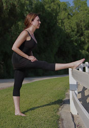 4. Exhale and lean forward slowly, keeping your hips parallel to the fence. Don’t allow one hip to come forward in front of the other. Hold for a count of five and repeat three times