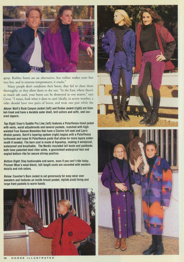 Once again, we brought you the latest and greatest equestrian fashions. This time it was awesome winter wear for the barn, featured in the February 1995 issue. Winter riding pants are a brilliant idea, but some of these mid-nineties versions were baggy and had a windproof outer shell that made them look dangerously similar to what we affectionately call, “hammer pants.” (Google it, whippersnappers.) We also featured a couple of western-themed, full-length coats specifically NOT for riding. It’s difficult to get into the saddle when the coat you’re wearing extends to your ankles.