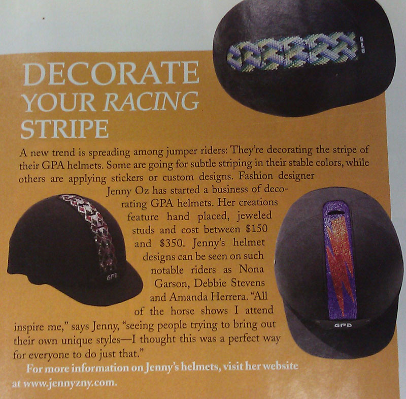 Bling in the hunter ring? Say it ain’t so! After the Euro-style (or skunk-style) helmets became popular, jumper riders felt the freedom from the traditional hunt cap style and decided to run with it. In 2004, we featured custom decoration for your new helmet, a fun new way to add color do show-ring-attire monotony. Rumor has it the trend leaked into the hunter ring for a time before the traditionalists put the kibosh on that. Oh well. It was fun while it lasted.