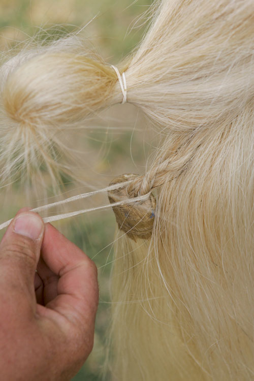 Tail Extensions Step 1313.To prevent your horse from stepping on her extension in between classes, loosely braid the bottom of the extension and secure it with a rubber band.
