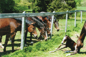 Krena said: A new foal trying to stand on a spring day with the help of her mother. Friends watch and encourage in the next pasture.