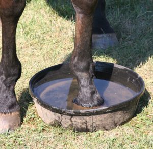 Soaking a horse's hoof in Epsom salt water for treatment of a hoof abscessStep 2:  Submerge the entire hoof up to the coronary band and soak for 10 minutes.  This will help draw out the infection and will encourage the abscess to erupt if it has not already been opened and drained.