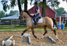 The 20-meter circle is a great place to start because the slight bend of the circle will automatically encourage the horse to bear more weight on his haunches. Pick up a trot and ride a circle that begins and ends at the same place. If you don’t have a dressage arena, you can set out cones or buckets to create boundaries and focal points. Keep a steady tempo (speed) and consistent contact, and continue to trot around your circle. If all is well, add some downward transitions to the walk, using the half-halt: close your hand, close your lower leg, tighten your back muscles and sit a little heavier in the saddle. This aid should only last a stride, but repeat if needed. Take a few steps at the walk and then move back to the trot again, repeating the transitions.