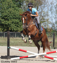 Q: My horse is a young Thoroughbred I recently adopted from a rescue site. I’ve started him over low jumps, and his hind end seems very overpowering when he soars over them. I feel like he’s pushing me out of the saddle. Is this just his style of jumping or am I doing something wrong?