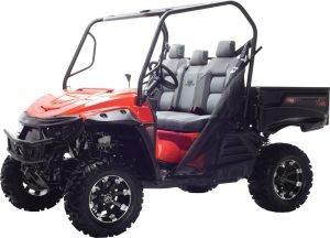 Power options include a 750-cubic-centimeter Kohler gas engine (cargo bed capacity: 1,200 pounds; towing: 2,100 pounds); a 48-volt brushless electric (cargo bed capacity: 700 pounds; towing: 1,500 pounds) or a 1,000-cubic-centimeter Kohler diesel engine (cargo bed capacity: 1,200 pounds; towing: 2,100 pounds). Other key features include bench seats for up to three adult passengers and a full-size bed.