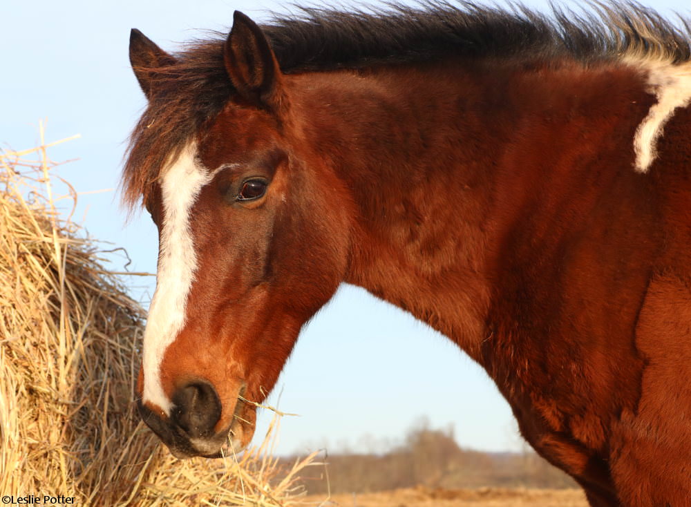 The majority of a horse’s diet should be forage (hay or pasture). Forage is high in fiber, which is what the horse’s gut runs on. Fiber passes into the huge large intestine and is broken down by tiny microbes in a process called fermentation. Microbes convert the fiber into calories the horse can use, which differs from how humans digest their food and get energy.