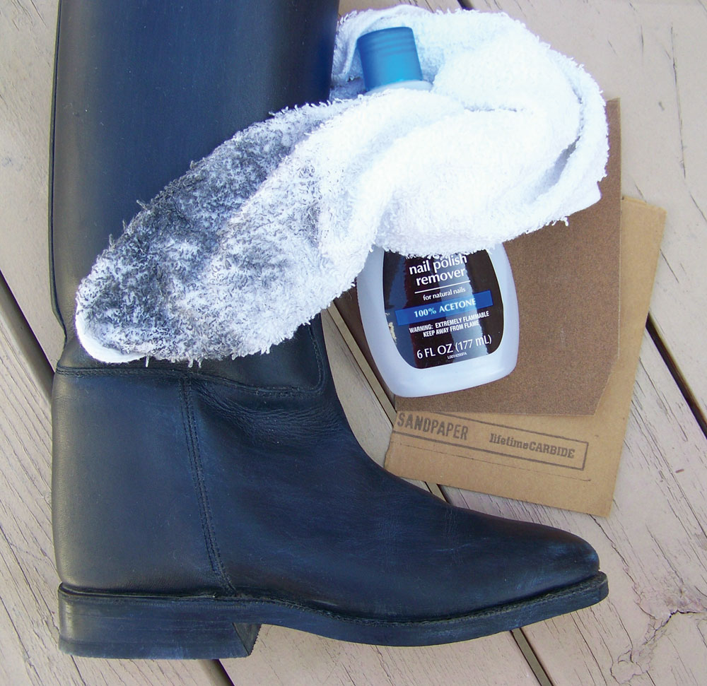1. First, you’ll need to strip the layers of wax, polish and dye from the leather.Due to fumes from the acetone, work outside or in a ventilated craft room. Wet a terry cloth rag with nail polish remover. Rub it vigorously over the entire boot. If you meet resistance, scuff the area with sandpaper and rub again. Eventually, layers of wax, polish and dye will be wiped away. Now your paint can penetrate the leather and provide rich, permanent color.