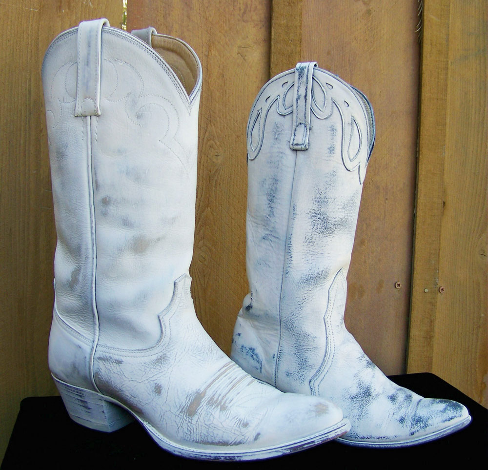 The local drill team spray painted their boots white. Months later, they opted for a darker color palette, and I found their cast-offs at the thrift store. Although it took me half a day and several bottles of nail polish remover, I finally uncovered the boots’ quality leather.