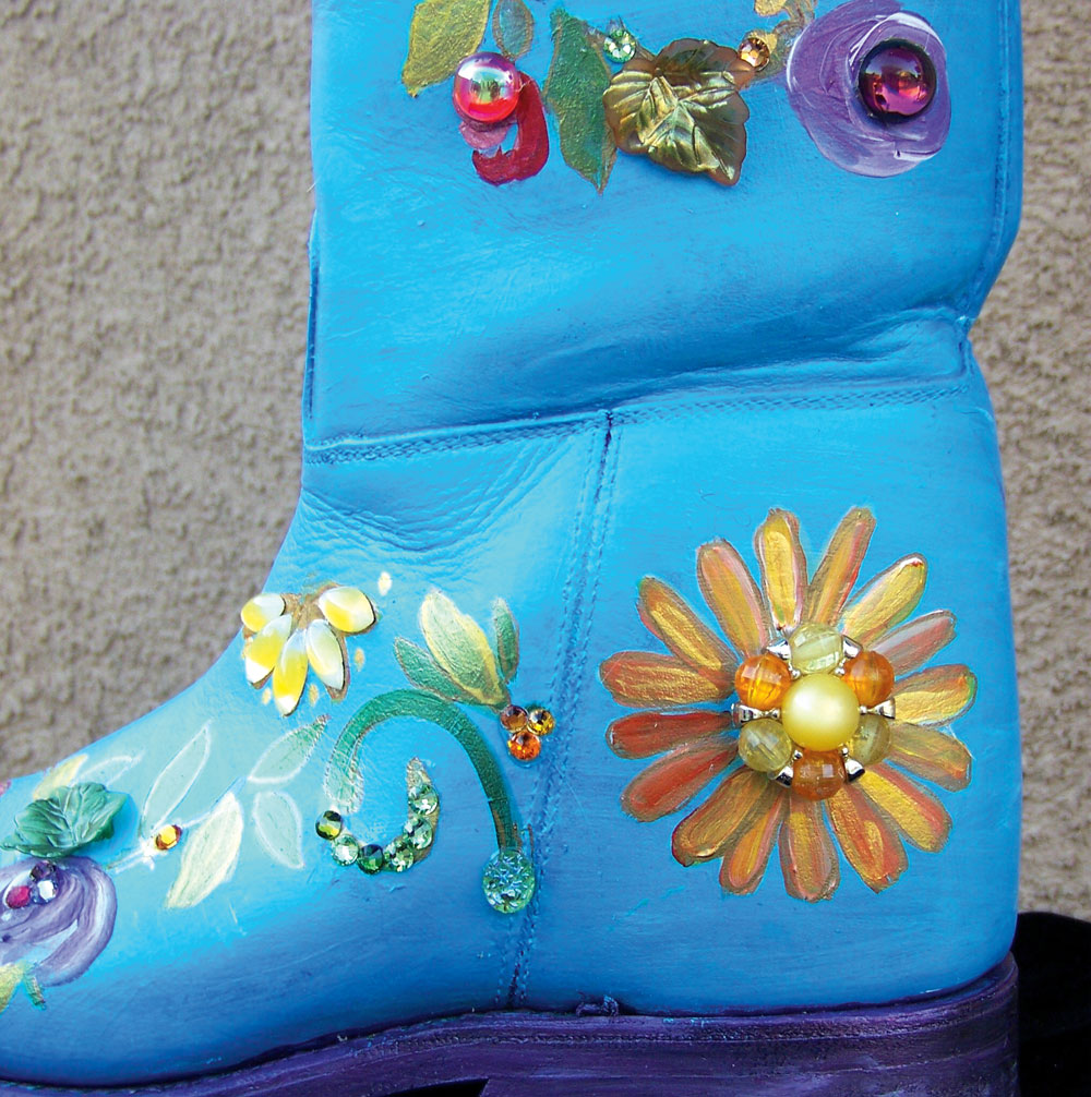 Vintage jewelry, like this clip-on earring, add dimension to your design and also emphasize the boot’s one-of-a-kind appeal. Use such baubles sparingly, though, or they’ll detract from the novelty and charm of your transformed boot.