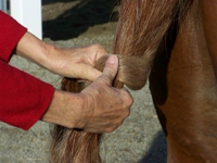 By spring of the next year, I started to experience other problems with Peanut. Bridling became an issue—he didn’t want to take the bit. Within a month, I began having problems taking the bridle off as well. He would throw his head up and not drop the bit. I knew now that something was seriously wrong.