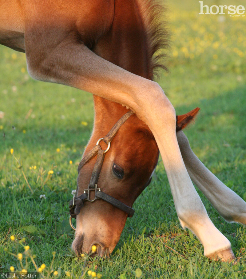 It may seem like your foal does nothing but eat and sleep in his first few weeks of life, and for good reason. Foals stand and nurse about every 20 minutes. At about 2 weeks old, the duration of these sessions will decrease as the foal begins to nibble on grass or hay. By 5 to 7 months old, 70 percent of a foal’s nutrient intake will come from sources other than milk, which is why weaning is recommended about this time.