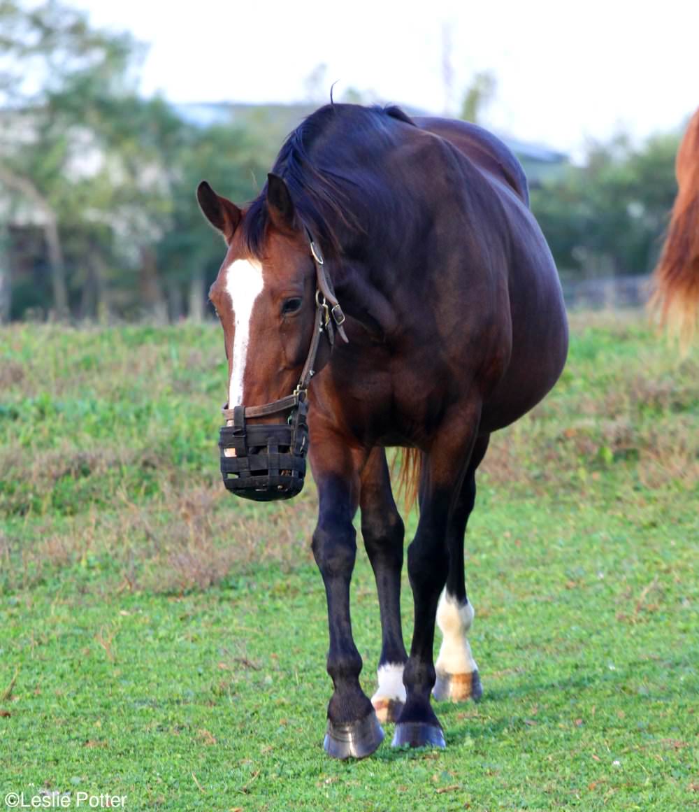Studies have shown grazing muzzles can reduce grass consumption by over 80 percent, although some crafty horses are able to still devour almost unchecked. If this is the case, your horse should be moved to a dry lot, where he can eat his hay in a small-hole net instead of grazing.