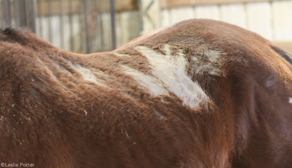 • Dermatophilosis (rain rot, rain scald, mud fever) is a bacterial infection aggravated by prolonged exposure to moisture coupled with injured skin. “Chronically infected animals are the primary source of infection,” Sargent explains. “Transmission can occur by flies, ticks, grooming equipment and tack. Once the disease has occurred within a barn or an individual horse, it is generally there to stay, just waiting for favorable weather conditions to reappear. In fact, any horse can be infected and once they have been, will often get it every year.”Look for: Lesions over the back and rump, although any area can be affected. “The lower layer of hair is firmly matted in small scabs which, when plucked may leave a characteristic ovoid [egg-shaped] bleeding surface,” Sargent says. “The undersurface of the scab is concave with the roots of the hair protruding and may have a covering of yellowish-orange pus. The affected areas are sore to touch, but are not itchy to the horse.”Treatment: Often resolves spontaneously after moving the horse to a dry environment. Also helpful is daily bathing with antimicrobial shampoos (chlorhexidine or povidone iodine) for the first week, then twice weekly until healed. Severe cases require oral or injectable antibiotics.