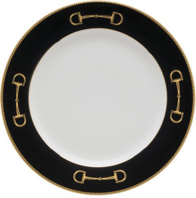 This chic luncheon plate features a sleek twist on snaffle bits with gold accents against a black background. They are hand-painted on porcelain and made in the United States; also available in brown.