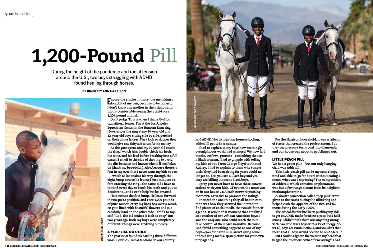 ◆ 1st place in Personal Column for “1,200-Pound Pill” by Kimberly Ann Harrison in the October 2023 issue of Horse Illustrated magazine (out of 11 entries)