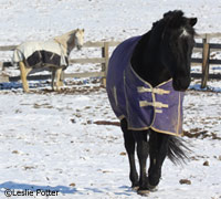 Horse in the snowGrowing up in Northwest Indiana, where lake effect snow is a way of life, one of the things that worried me most about winter was my horse. Whenever the weatherman predicted a snowstorm approaching, I fretted over whether he was sheltered and warm enough. When anxiety reached hysteria, I would jump in my car for a treacherous drive on icy roads in order to outfit my horse with an extra blanket, a hood and some standing wraps for good measure. Leaving my horse to awkwardly stretch his multi-layered neck into his bucket to slurp down a steaming hot bran mash, I would slip and slide my way back home, with feet that felt like twin blocks of ice and numb fingers that required painful attempts at thawing.