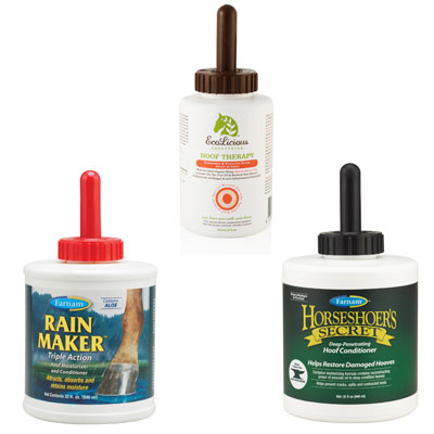 | Farnam Horseshoer’s Secret Deep-Penetrating Hoof Conditioner includes the reconstructing power of avocado oil to condition hooves and help prevent cracks, splits and contracted heels. www.farnamhorse.comEcoLicious Equestrian Hoof Therapy All Natural Restorative and Protective Serum protects and heals with antibacterial, antifungal and anti-inflammatory botanicals and the essential fatty acids vital for healthy hoof growth. www.ecoliciousequestrian.com Farnam Rain Maker Triple Action Hoof Moisturizer & Conditioner incorporates pine tar, lanolin and aloe for stronger and more pliable hooves. | ||