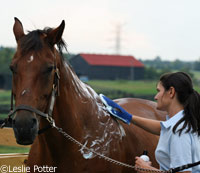 Although your time budget might not allow for a thorough grooming after your ride, you can whisk away the worst of the sweat with a sponge that’s been dunked in a bucket of water mixed with a couple capfuls of liniment. The astringent in the liniment will help the water evaporate quickly and thereby add a heightened cooling effect. Walk your horse until he’s mostly dry. Give him a treat and promise him a day sometime soon when you will make a fuss over him.