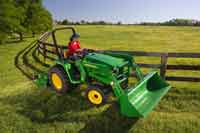 The model 305 Loader is compatible with the 3032E, and 3038E Tractors and features a Quik-change attachment carrier allowing for fast and easy removal/mounting of attachments without tools. Great for transporting feed, rock, gravel, sand, soil and so on. For more information or to find a dealer, visit deere.com