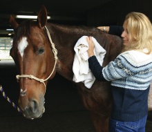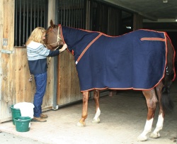 When you finish an area, take a dry towel and rub the hair in the same manner. Your last stroke should be against the direction the hair grows so it is standing up; this will help it dry quicker. As soon as you finish toweling, cover your horse with a cooler to keep him from getting chilled and to speed drying. Once he is dry, spray his coat with a coat conditioner to moisturize the hair and help repel dust, then finish with a regular brushing.
